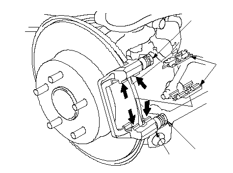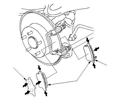 Нанесите смазку Molykote M77 на прокладки (А) со стороны тормозных колодок, заднюю часть тормозных колодок (В) и другие места, указанные стрелками. Уберите излишки смазки с прокладок и колодок. Не допускайте попадания смазки на поверхность тормозных дисков и тормозных накладок. Смазка, попавшая на тормозные диски или накладки, снижает эффективность торможения.
