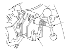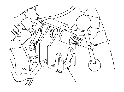 Установите плавающую скобу. Закрутите фланцевый болт (D) и затяните его до указанного момента, удерживая штифт ключом. При этом будьте осторожны, чтобы не повредить манжеты штифта и троса стояночного тормоза.