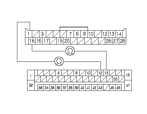 Проверьте непрерывность соединения между разъемом D (28P) блока управления EPS и клеммой 47Р разъема блока управления-модулятора VSA (см. таблицу).