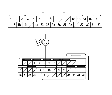 Проверьте неразрывность соединения между клеммами № 21 и № 22 32P разъема модуля управления приборами и клеммами № 16 и № 17 (39P) разъема А блока SRS.