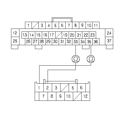 Проверьте неразрывность цепи между клеммами № 33 и № 35 37P разъема мультиплексного блока управления дверьми и клеммами № 1 и № 2 разъема В (12Р) блока климат-контроля/ блока управления обогревателем.