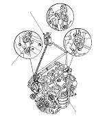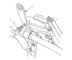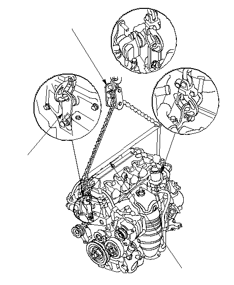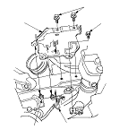 Подсоедините комплект для подъема двигателя в наклонном положении (приспособление, имеющееся в продаже для моделей, поставляемых в ЕС) к двигателю, как показано на рисунке. Установите двигатель на место в автомобиле.