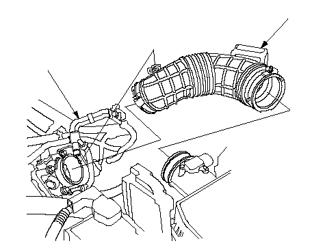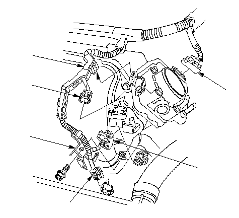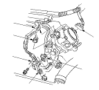 Отсоедините разъем датчика абсолютного давления (МАР) (А), разъем исполнительного элемента привода дроссельной заслонки (В) и дополнительный жгут проводов стартера (С).