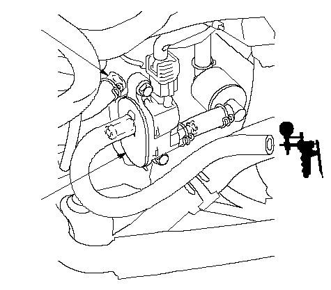 Отсоедините вакуумный шланг (А) от бачка абсорбера EVAP (В) и подсоедините к клапану продувки бачка абсорбера EVAP вакуумный насос/вакуумметр.
