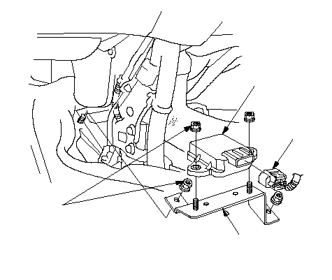 Открутите гайки крепления датчика угловой скорости/поперечного и продольного ускорения автомобиля (A).