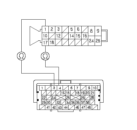 Проверьте неразрывность цепи между клеммой 25Р разъема блока управления-модулятора ABS и клеммой разъема А (49Р) блока ECM/PCM (см. таблицу).