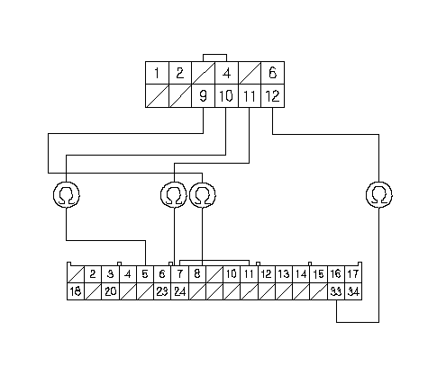 Проверьте неразрывность цепи между клеммами разъема М (34Р) блока реле/предохранителей под панелью приборов и клеммами 12Р разъема комбинированного переключателя освещения, как показано на рисунке: