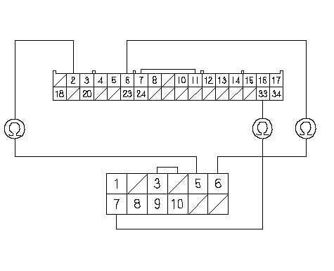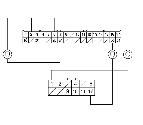 Проверьте неразрывность цепи между клеммами № 2, № 6 и № 33 разъема М (34Р) блока реле/ предохранителей и клеммами № 5 [№ 2], № 6 [№ 1] и № 7 [№ 12] 12P разъема комбинированного переключателя освещения.