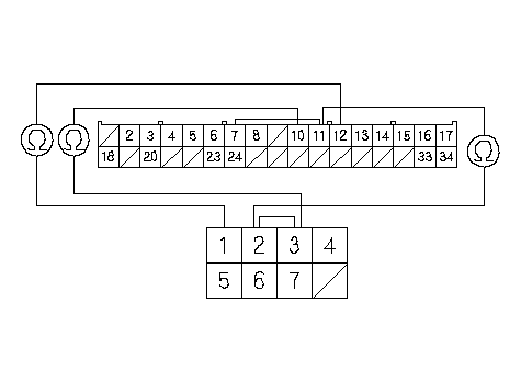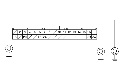 Проверьте неразрывность цепи между клеммами № 10, № 11 и № 12 разъема М (34Р) блока предохранителей/реле под панелью приборов и "массой" кузова по отдельности.