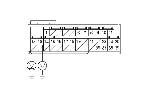 Измерьте напряжение между клеммами № 12 и № 13 разъема В (39P) блока SRS и "массой" кузова. Напряжение должно быть не более 1 В.