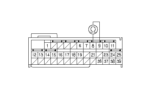 Измерьте сопротивление между клеммами № 8 и № 9 разъема В (39Р) блока SRS. Сопротивление должно быть 0 - 1,0 Ω.