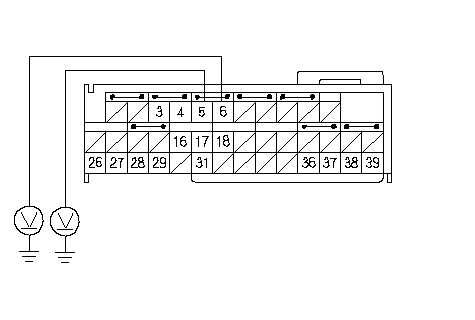 Измерьте напряжение между клеммами № 5 и № 6 разъема A (39P) блока SRS и "массой" кузова. Напряжение должно быть не более 1 В.