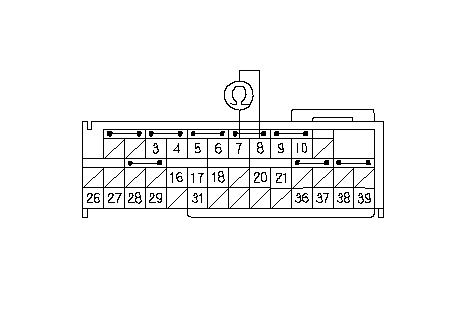 Измерьте сопротивление между клеммами № 7 и№ 8 разъема А (39Р) блока SRS. Значение должно быть менее 1,0 Ω.