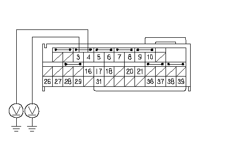 Измерьте напряжение между клеммами № 3 и № 4 разъема A (39P) блока SRS и "массой" кузова. Напряжение должно быть не более 1,0 В.
