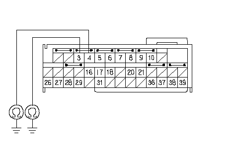 Измерьте сопротивление между клеммами № 3 и № 4 разъема A (39P) блока SRS и "массой" кузова. Значение должно быть менее 1,0 Ω.