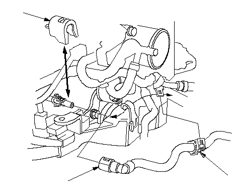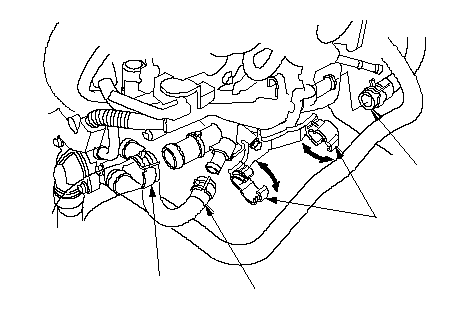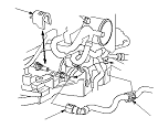 Отсоедините верхний шланг радиатора (А), шланг отопителя (В) и шланг перепуска охлаждающей жидкости (С).