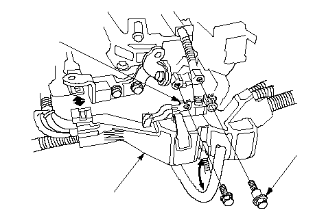 Снимите крепежный болт держателя жгута проводов (A) и кабель "массы" (B), затем снимите держатель жгута проводов (C) с кронштейна.