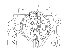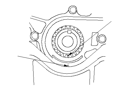 Установите коленчатый вал в положение верхней мертвой точки (ВМТ). Совместите метку ВМТ (А) на звездочке коленчатого вала с указателем (В) на масляном насосе.