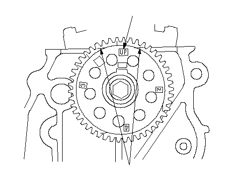 Установите распределительный вал в положение верхней мертвой точки (ВМТ). Метка ‘‘UP'' (А) на звездочке распределительного вала должна находиться сверху, и метки верхней мертвой точки (ВМТ) (В) на звездочке должны совпадать с верхним краем головки цилиндров.