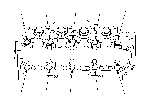 Затяните болты головки цилиндра последовательно до 29 Н·м (3,0 кгс·м). Используя динамометрический ключ балансирного типа (beam-type). При использовании динамометрического ключа затягивайте резьбовые соединения медленно и не перетягивайте их. Если при затяжке болта раздается посторонний звук, отпустите болт и начните затягивать его с самого начала.
