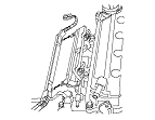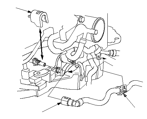 Установите верхний шланг радиатора (А), шланг отопителя (В) и шланг перепуска охлаждающей жидкости (С).