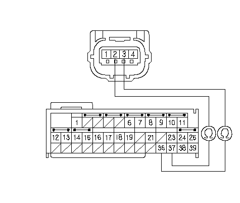 Измерьте сопротивление между клеммой № 36 разъема В (39P) блока SRS и "массой" кузова, и между клеммой № 37 и "массой" кузова.