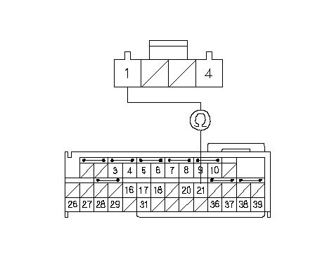 Проверьте неразрывность цепи между клеммой № 1 4Р разъема жгута проводов панели приборов и клеммой 21 разъема А (39Р) блока SRS.
