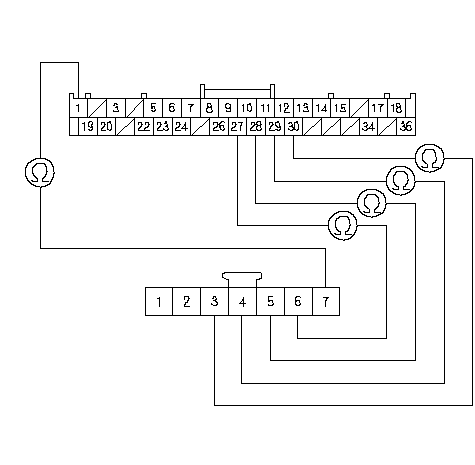 Проверьте наличие соединения между следующими клеммами 36Р разъема блока климат-контроля и 7Р разъемом электродвигателя управления режимами.
