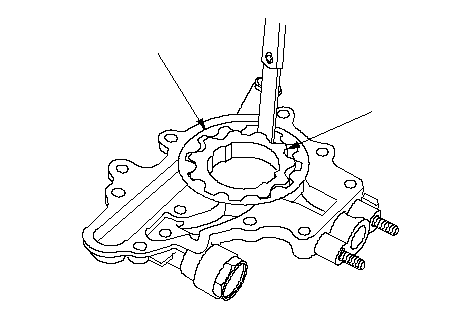 Проверьте радиальный зазор между внутренним и внешним роторами (между внутренним ротором (А) и внешним ротором (В)). Если зазор между внутренним и внешним роторами превышает предельное значение, замените масляный насос в сборе.